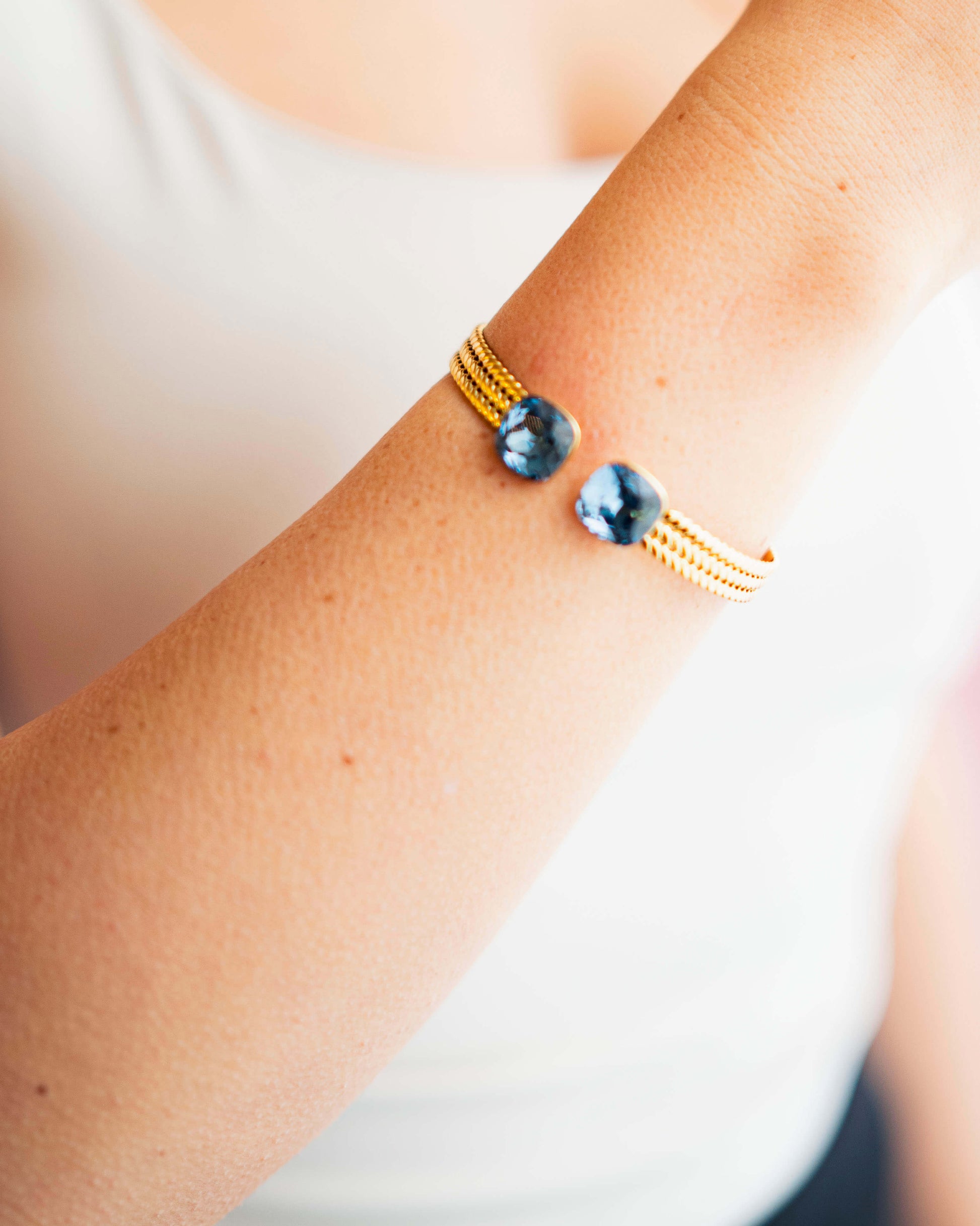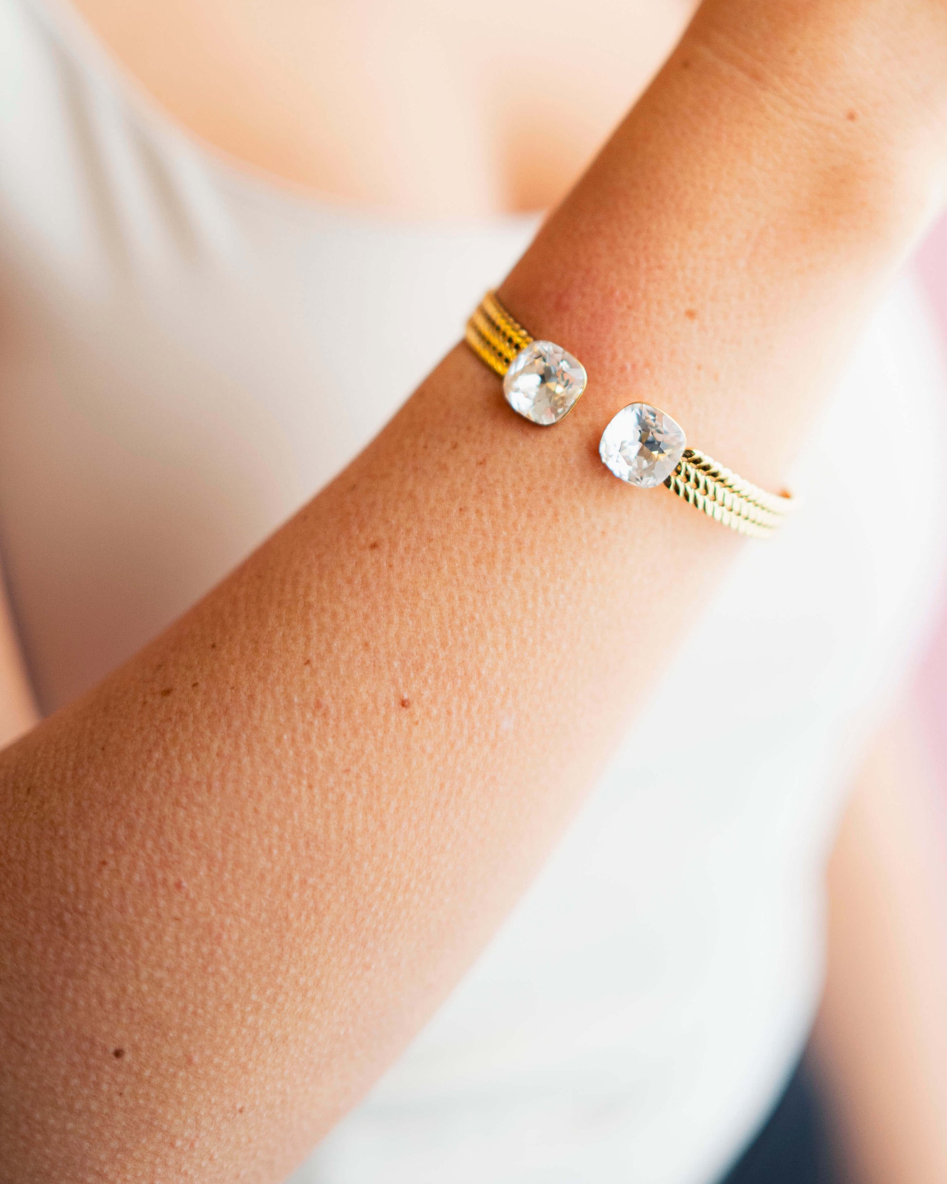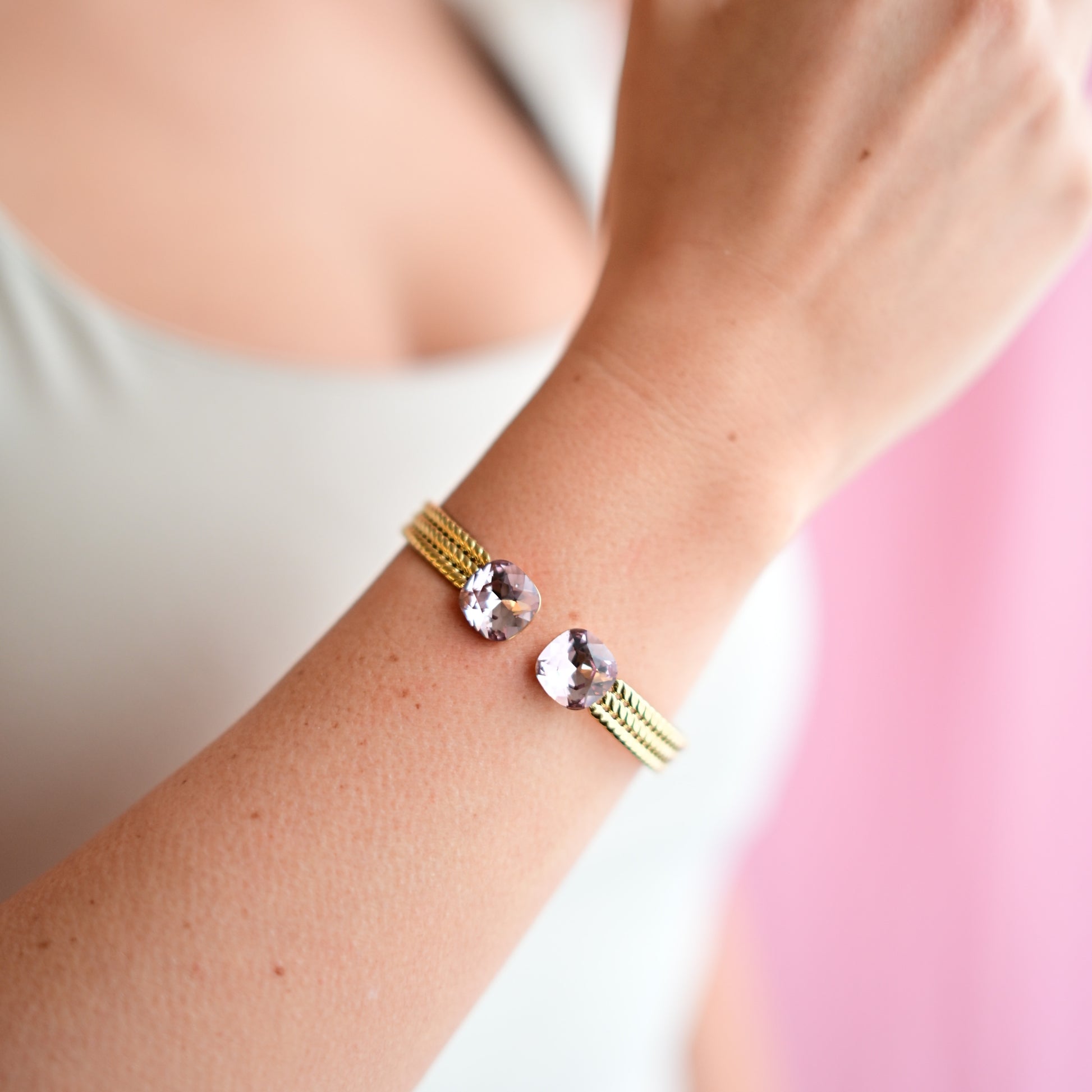 Des joncs en acier inoxydable tressé, résistants et hypoallergéniques, ornés de cristaux Swarovski® qui captent la lumière à chaque mouvement.