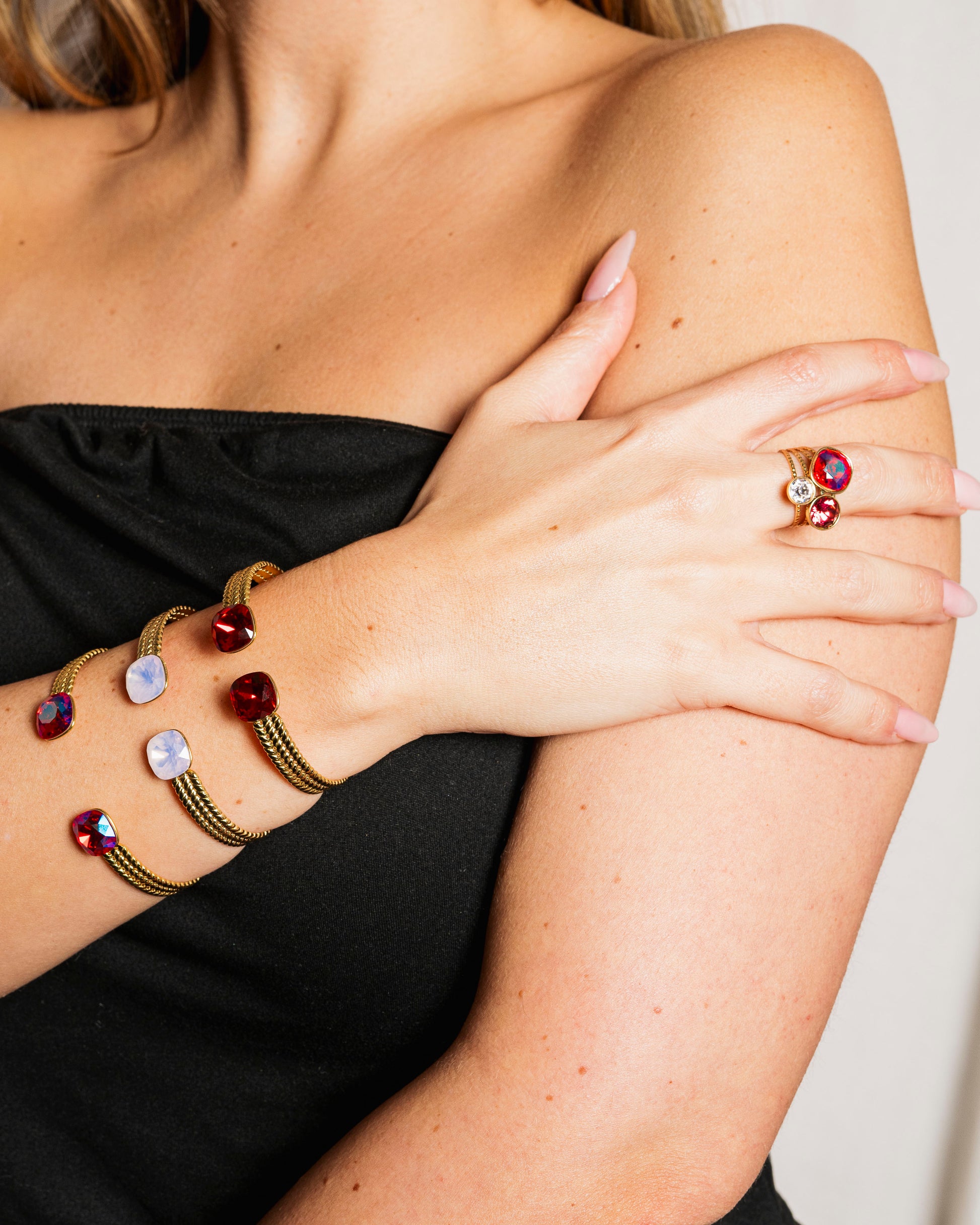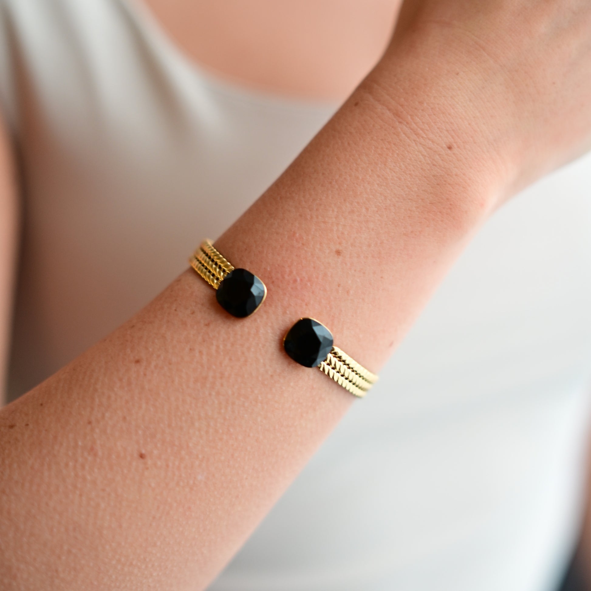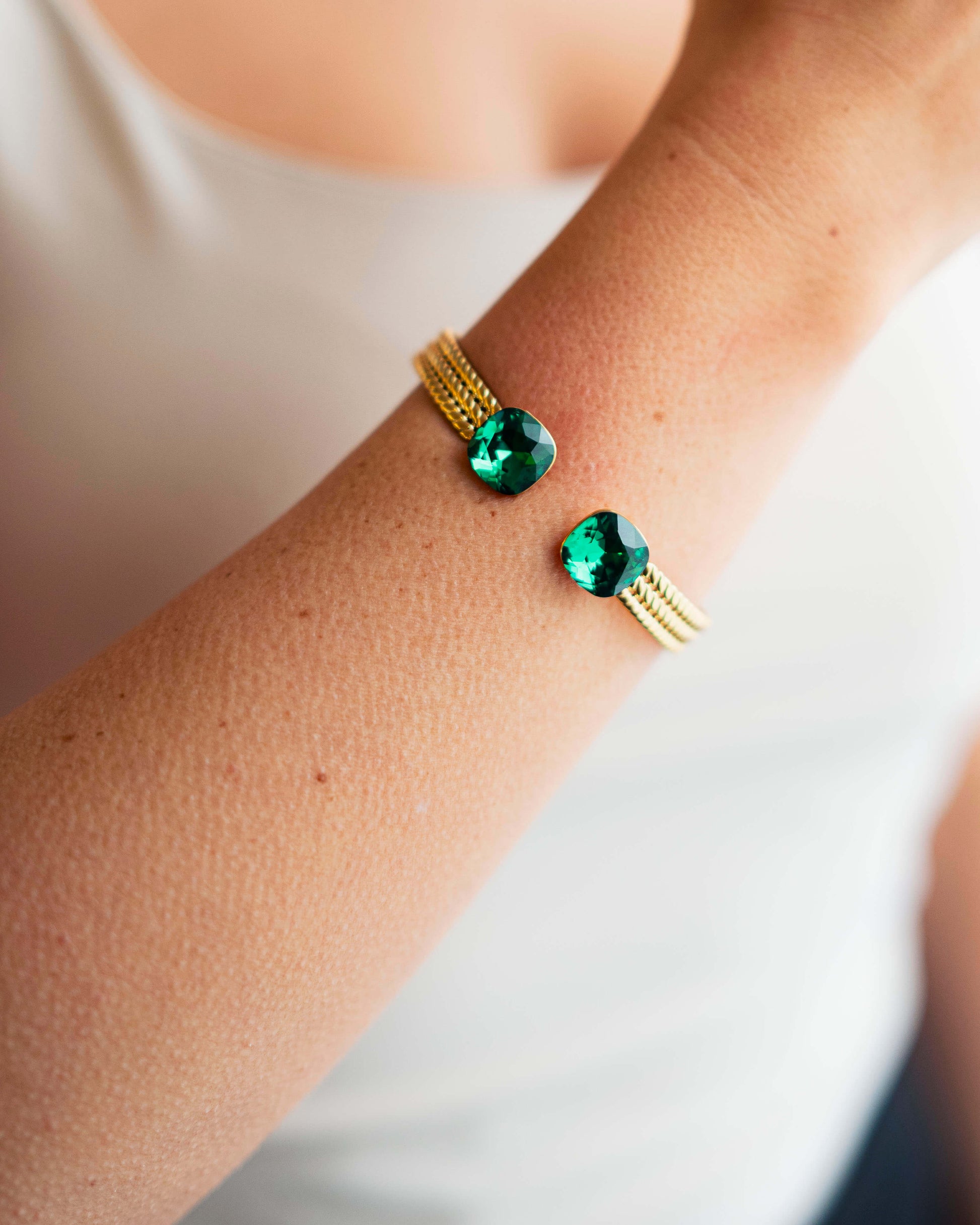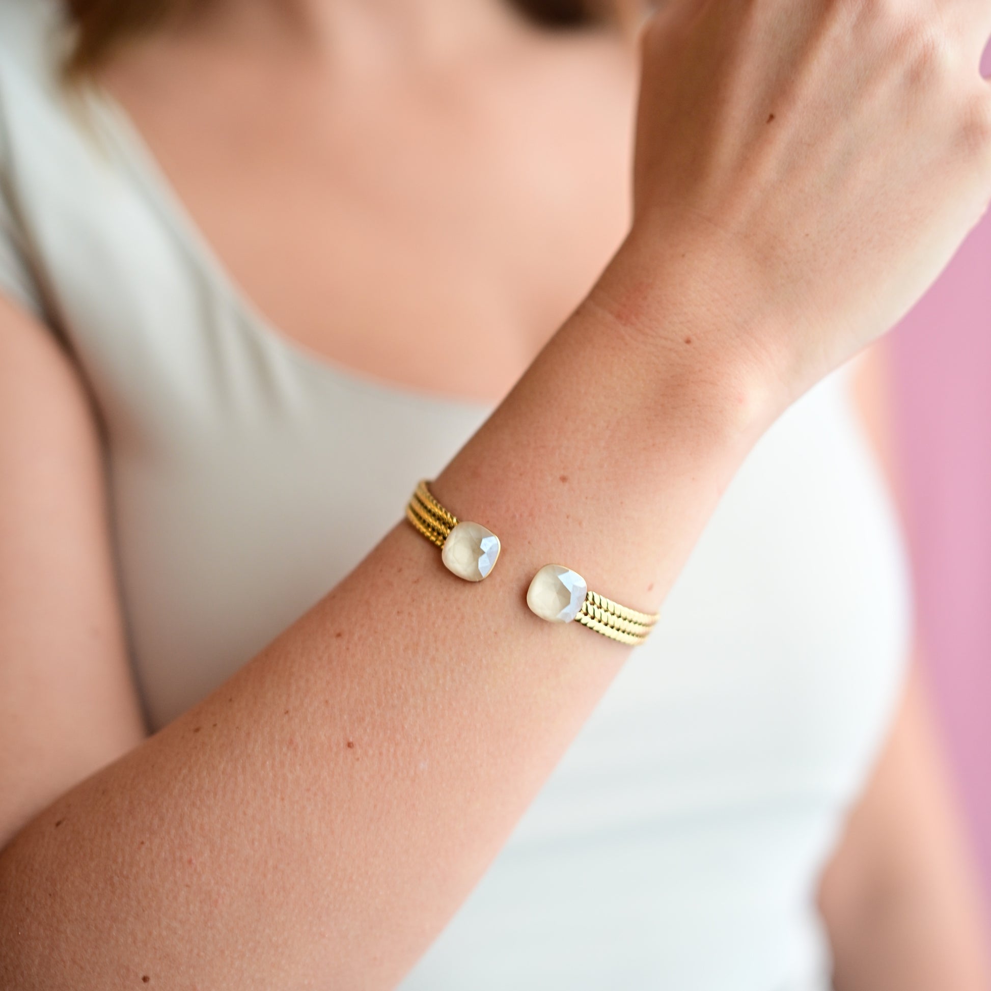 Des joncs en acier inoxydable tressé, résistants et hypoallergéniques, ornés de cristaux Swarovski® qui captent la lumière à chaque mouvement.