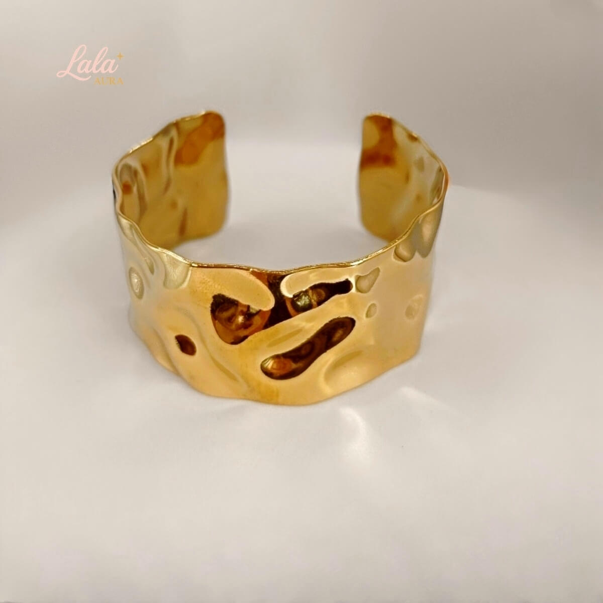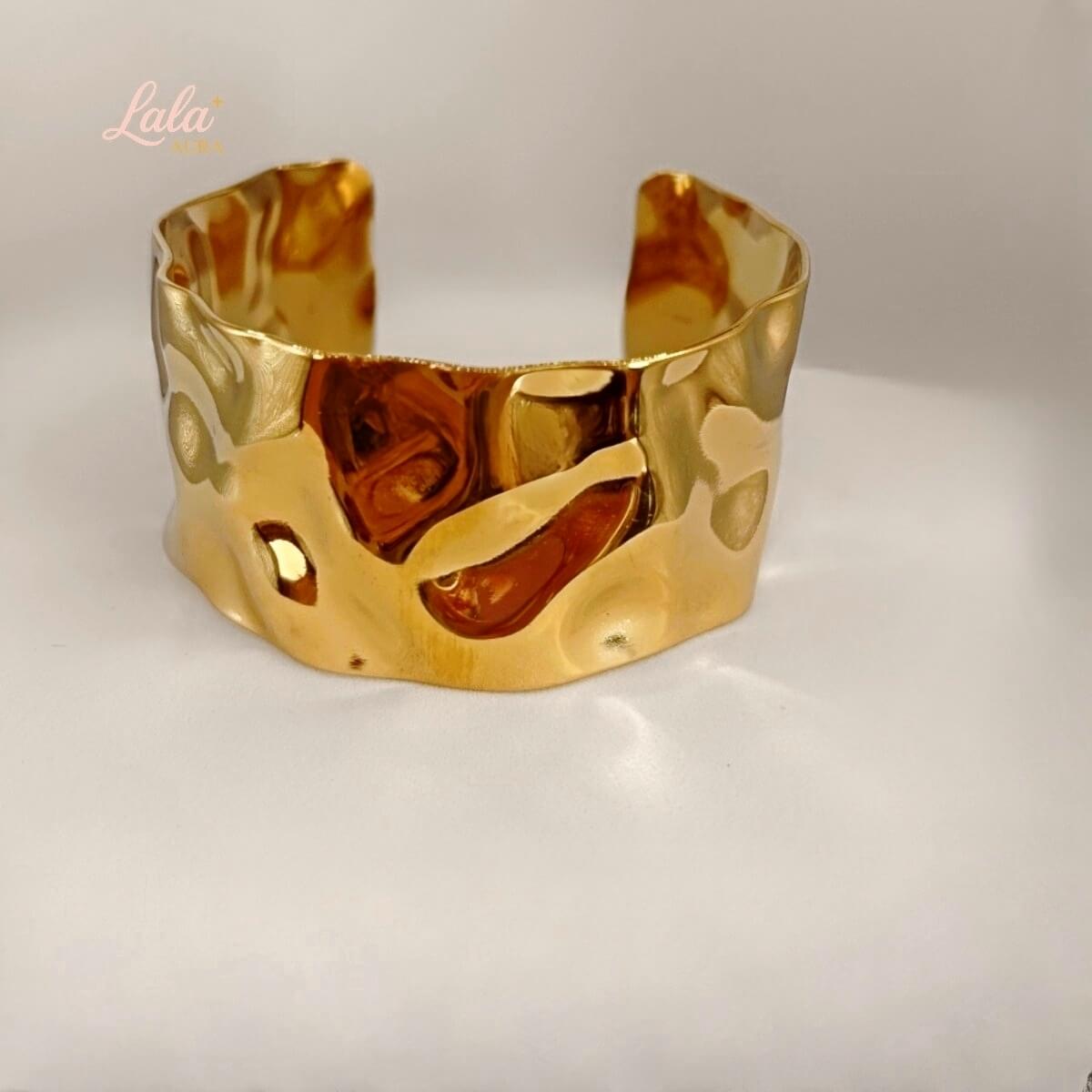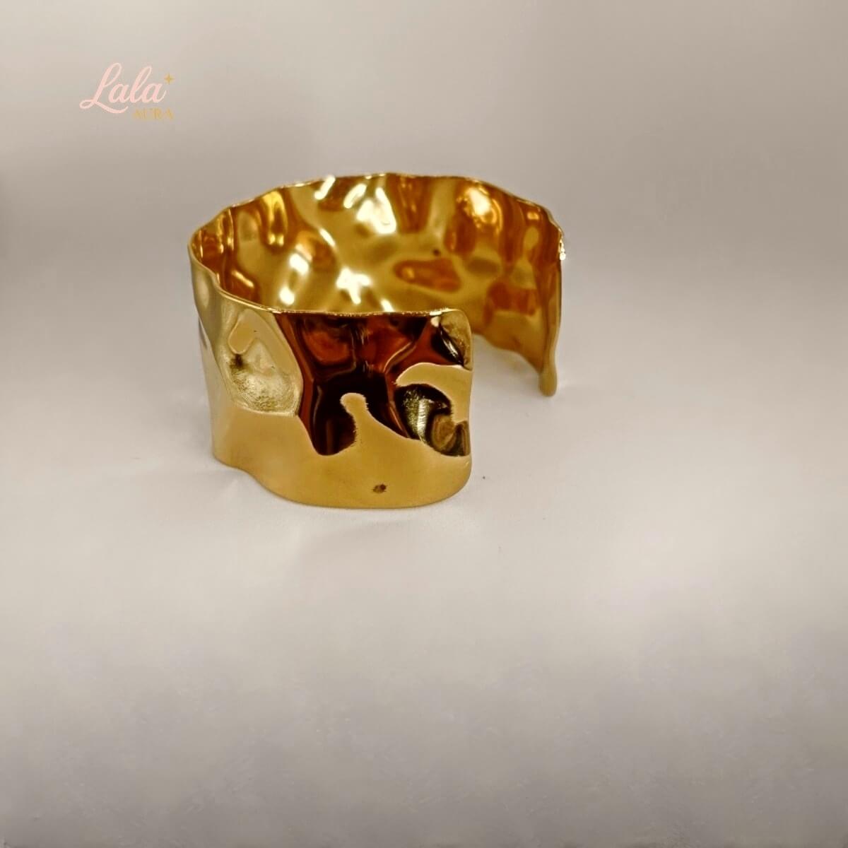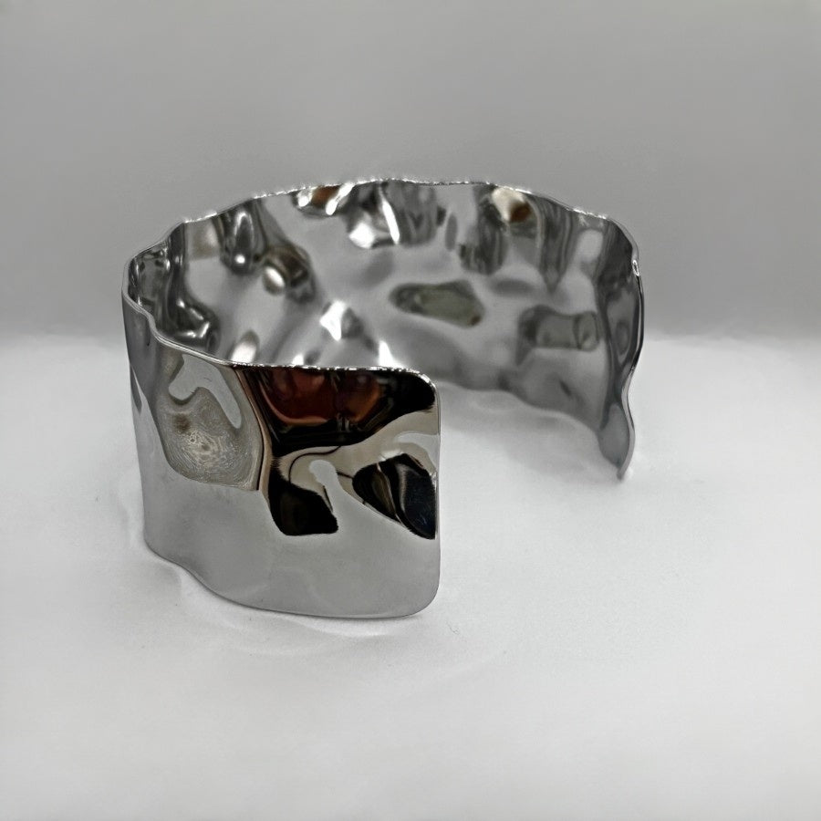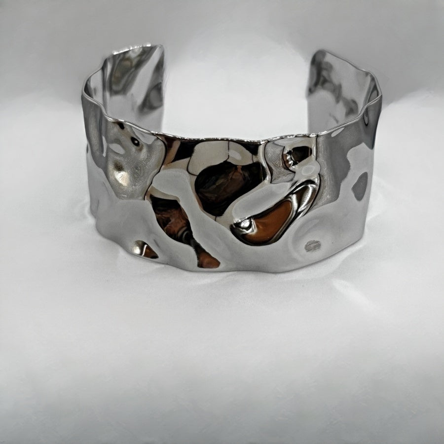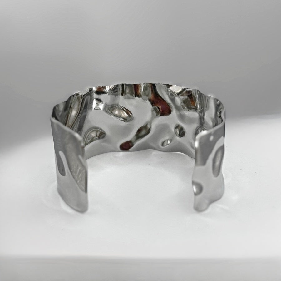 Manchette sculpturale en acier inoxydable, pensée comme un anneau martelé qui capte la lumière avec douceur. Sa matière malléable permet d’ajuster légèrement l’ouverture pour un porté confortable et personnalisé.
