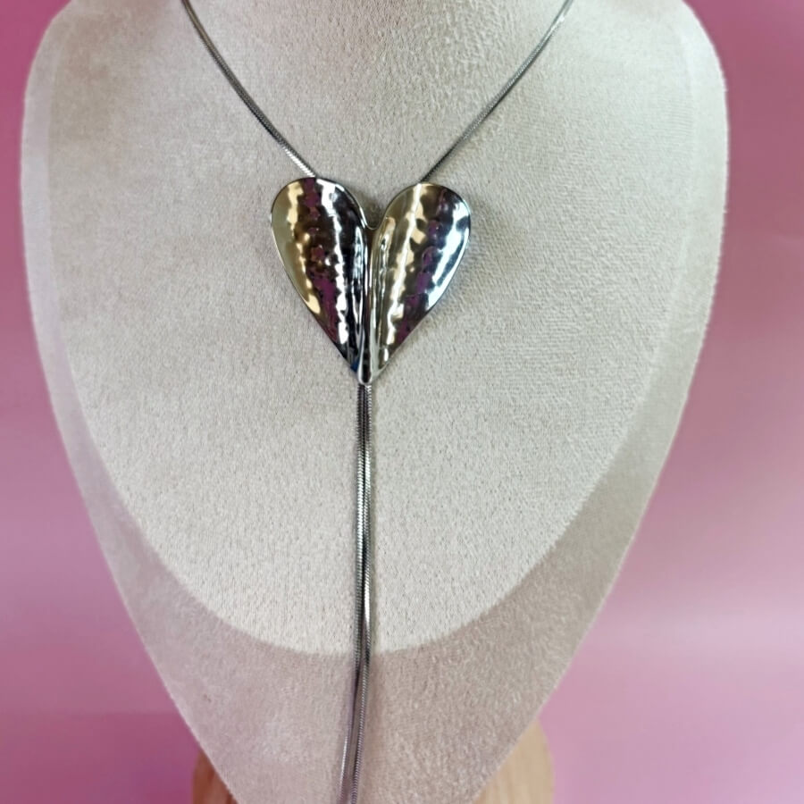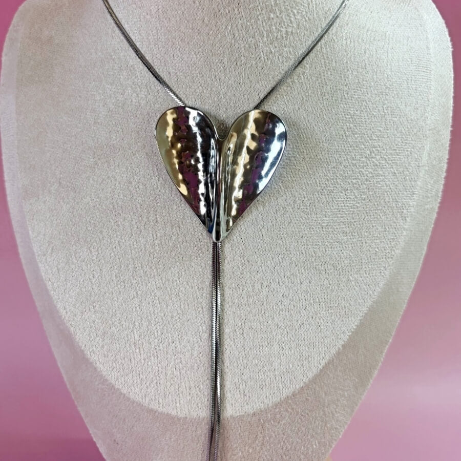 Le sautoir Pulse est un long collier en acier inoxydable argent, composé d’un grand cœur texturé et incurvé qui glisse le long d’une chaîne lisse et élégante.